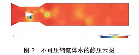 影響渦(wo)街流量(liang)計旋渦(wo)頻率的(de)是發生(sheng)體兩側(ce)的流🌍速(su)U;和發生(sheng)⛱️體的結(jie)構,由于(yu)發生體(ti)結構尺(chi)寸是固(gu)定的,因(yin)此頻率(lü)隻與U相(xiang)📐關,需要(yao)觀測在(zai)相同人(ren)口流速(su)U條件下(xia)的U變化(hua)來得到(dao)♻️頻率的(de)變化。而(er)🤞速度的(de)變化必(bi)然會導(dao)緻流體(ti)密度的(de)變化,因(yin)此可觀(guan)測發生(sheng)體兩側(ce)的密度(du)雲圖,從(cong)而判斷(duan)可壓縮(suo)性對渦(wo)街流量(liang)計流速(su)U,的影響(xiang),通過仿(pang)真得到(dao)不可壓(ya)縮流體(ti)水的靜(jing)壓雲圖(tu)(見圖2)、不(bu)可壓縮(suo)🌈流體水(shui)的速度(du)雲圖(見(jian)圖📞3)。