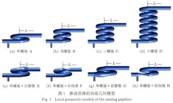 爲研(yan)究管路(lu)結構對(dui)摻氫天(tian)然氣摻(chan)混狀态(tai)影響,本(ben)文在單(dan)螺旋管(guan)摻混管(guan)路的基(ji)礎上,使(shi)用Design.modeler構建(jian)了8種摻(chan)混管路(lu)的3維模(mo)型,如圖(tu)❄️1所示。摻(chan)混管路(lu)分别爲(wei)不🔞同匝(za)數螺旋(xuan)管(單螺(luo)旋A型、雙(shuang)螺旋B型(xing)、三螺旋(xuan)C型、六螺(luo)旋D型)和(he)單⛱️螺旋(xuan)管路結(jie)合變徑(jing)管路(單(dan)螺旋+後(hou)膨脹E型(xing)、單螺旋(xuan)+後收縮(suo)F型、單螺(luo)旋+前膨(peng)脹G型、單(dan)螺旋+前(qian)收縮H型(xing))。由于将(jiang)密度較(jiao)輕氫氣(qi)從🤞底部(bu)充入天(tian)然🆚氣管(guan)🏃♂️路能取(qu)得較好(hao)的摻混(hun)效果,因(yin)此設🔅計(ji)從管路(lu)底部🧡充(chong)📐入天然(ran)氣。具體(ti)參數設(she)置爲:管(guan)路直徑(jing)D=100mm,甲烷入(ru)口🔴直徑(jing)爲1D,氫😘氣(qi)入口直(zhi)徑爲0.5D,出(chu)口💔直徑(jing)爲1D,螺旋(xuan)管曲率(lü)🈲半徑爲(wei)2D。氫氣入(ru)口(支管(guan)軸線)距(ju)螺旋管(guan)起始截(jie)面長🔅度(du)爲3D,多匝(za)螺🐕旋管(guan)螺距爲(wei)1.5D。膨脹管(guan)長度爲(wei)3D,膨脹管(guan)直♻️徑最(zui)大處爲(wei).1.5D;收縮管(guan)長度爲(wei)3D,收縮管(guan)直徑最(zui)小處爲(wei)0.5D。爲使氣(qi)體充分(fen)摻混,将(jiang)下遊管(guan)路總長(zhang)度設置(zhi)爲150D。在計(ji)算不同(tong)匝數👌螺(luo)旋管及(ji)單螺旋(xuan)管路結(jie)合變徑(jing)管路結(jie)果時,定(ding)義的長(zhang)度L是以(yi)螺旋.管(guan)終止截(jie)面爲起(qi)點。