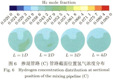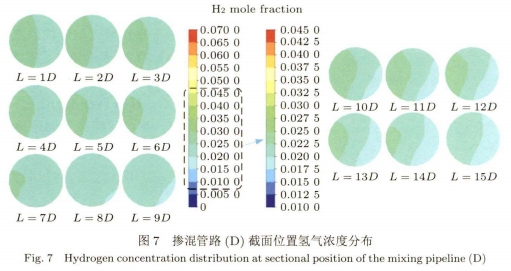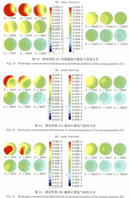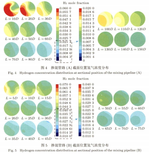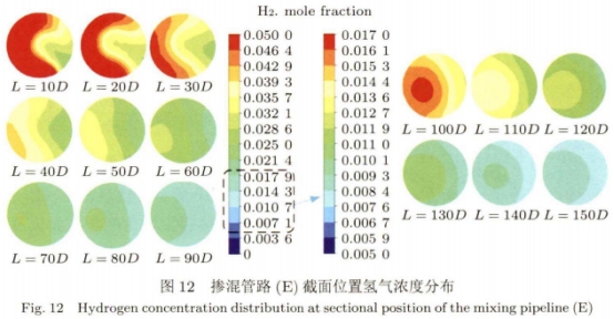 如(ru)圖4所示(shi)摻混管(guan)路A在螺(luo)旋管路(lu)出口處(chu)渦流作(zuo)用非常(chang)劇🏒烈💃🏻,其(qi)分層現(xian)象明顯(xian)。且不同(tong)于--般氫(qing)氣的上(shang)下分層(ceng),摻混管(guan)路A中管(guan)道🐪中的(de)氫氣直(zhi)存在左(zuo)右分👨❤️👨層(ceng),直至摻(chan)混距離(li)在140D~150D達到(dao)摻混均(jun)勻,此時(shi)氫氣摩(mo)爾分數(shu)均約爲(wei)0.8%。圖5所示(shi)摻混管(guan)路B的管(guan)路截面(mian)氫氣濃(nong)👉度分布(bu)變化💃規(gui)律與圖(tu)4相似,直(zhi)至摻混(hun)距離在(zai)65D~70D達到🔆摻(chan)混均勻(yun),氫氣基(ji)本不再(zai)分層,此(ci)時氫氣(qi)摩爾分(fen)數均約(yue)爲1.9%。而圖(tu)6所示🤞的(de)摻混管(guan)路C在螺(luo)旋管道(dao)出口處(chu)就✊已經(jing)基本達(da)到摻🈲混(hun).均勻,氫(qing)氣已基(ji)本不存(cun)在分層(ceng),此時氫(qing)氣摩爾(er)分數均(jun)約爲3.9%。相(xiang)比摻混(hun)管路C的(de)三匝螺(luo)旋管,圖(tu)7所示摻(chan)混管路(lu)D增加到(dao)六匝螺(luo)旋的摻(chan)混效果(guo)反而下(xia)降。螺旋(xuan)管道出(chu)口氫氣(qi)分層,直(zhi)至摻混(hun)15D時達到(dao)摻混均(jun)勻,氫氣(qi)不再分(fen)層,此時(shi)氫氣摩(mo)爾分數(shu)約爲🏃2.0%。
