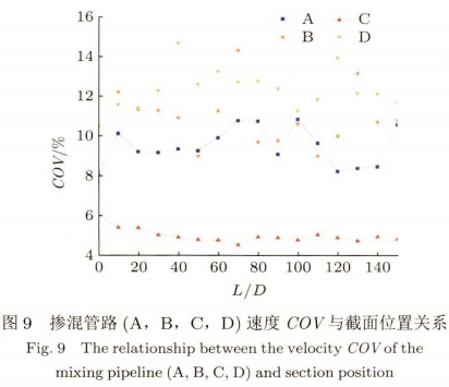 摻(chan)混管路(lu)(A,B,C,D)速度COV與(yu)截面位(wei)置的關(guan)系如圖(tu)9所示。随(sui)着截面(mian)㊙️位置🈲向(xiang)下遊移(yi)動,摻混(hun)管路(A,B,D)的(de)速度COV一(yi)直處于(yu)波動狀(zhuang)态,但皆(jie)👨❤️👨不超過(guo)15%。相比于(yu)A,B和D,摻混(hun)管路C内(nei)氣體速(su)度分布(bu)更爲均(jun)勻,其速(su)度COV-直穩(wen)定在5%左(zuo)右。綜合(he)考慮氣(qi)體摻混(hun)均勻度(du)💰μ和速度(du)COV,摻混管(guan)路C爲最(zui)佳摻混(hun)模型。