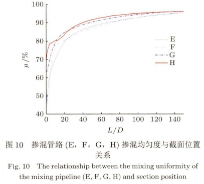 如(ru)圖10所示(shi)爲摻混(hun)管路(E,F,G,H)的(de)管路内(nei)氣體摻(chan)混均勻(yun)度與截(jie)面位☔置(zhi)關系,摻(chan)混管路(lu)E,F,G,H是在單(dan)螺旋的(de)基礎上(shang)添加變(bian)徑管(膨(peng)脹管或(huo)收縮管(guan)),分别在(zai)136D,132D,107D,96D處時實(shi)現氣體(ti)摻混均(jun)勻。相比(bi)單螺旋(xuan)管的💯146D,在(zai)不同🔱位(wei)置添加(jia)任何變(bian)徑管均(jun)能在.不(bu)㊙️同程度(du).上📧實現(xian)縮短摻(chan)混距離(li)的效果(guo)。将變徑(jing)管置于(yu)單螺旋(xuan)管之前(qian)氣體初(chu)步摻㊙️混(hun)後再進(jin)入單螺(luo)旋管進(jin)一步摻(chan)混,明顯(xian)比置于(yu)單螺旋(xuan)管之後(hou)更能有(you)效地縮(suo)短摻混(hun)♋。而氣體(ti)進入收(shou)縮管内(nei)流動速(su)度會增(zeng)大,此時(shi)的擾動(dong)🔞更加劇(ju)烈,有助(zhu)于氣體(ti)摻混。針(zhen)對變徑(jing)管位📧置(zhi)及類型(xing),摻混管(guan)路H(即前(qian)收縮.管(guan))的摻🛀混(hun)效果更(geng)好。