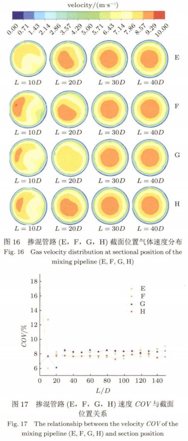 摻混(hun)管路(E,F,G,H)速(su)度COV與截(jie)面位置(zhi)的關系(xi)如圖17所(suo)示。初始(shi)截面位(wei)置時,摻(chan)混管路(lu)(E,H)的速度(du)COV最大,約(yue)爲17%。而随(sui)着截面(mian)位置向(xiang)管道的(de)下遊移(yi)動,這四(si)種類型(xing)的摻混(hun)管路的(de)速度COV均(jun)穩定在(zai)8%附近。雖(sui)然四種(zhong)類⭕型的(de)摻混管(guan)👄路最終(zhong)穩定時(shi)的COV差别(bie)很小,但(dan)👨❤️👨相比摻(chan)混管路(lu)(E,F,G),摻混管(guan)路(H)的速(su)度COV達到(dao)穩定時(shi)所需的(de)距離最(zui)短,僅需(xu)10D。故摻混(hun)管路H爲(wei)最佳摻(chan)混模型(xing)。