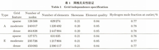 本文利(li)用ANSYSWorkbench中的(de)Mesh模塊,選(xuan)用四邊(bian)形或三(san)角形網(wang)格法對(dui)流體♈域(yu)進行網(wang).格劃分(fen)。網格數(shu)量對Fluent仿(pang)真計算(suan)結果有(you)至關💰重(zhong)要的影(ying)響。理🔴論(lun).上所采(cai)用的特(te)征尺寸(cun)網格越(yue)小,得到(dao)的仿真(zhen)結果越(yue)正确。但(dan)随着網(wang)格數量(liang)的增加(jia)🔞,對計算(suan)硬件資(zi)源的要(yao)求更高(gao)🚩,而且導(dao)緻計算(suan)時間延(yan)長,降低(di)求解結(jie)果的收(shou)斂🔞性。本(ben)文以摻(chan)混管路(lu)A,E爲代表(biao)👄,分析稀(xi)疏、中等(deng)、稠密三(san)種網格(ge)特點對(dui)出口氫(qing)氣濃度(du)變化的(de)影響,進(jin)行網格(ge)無關性(xing)驗證。結(jie)果如表(biao)1所示,随(sui)✉️網格數(shu)量增加(jia),不同網(wang)格特點(dian)出口處(chu)氫氣摩(mo)爾分數(shu)波動很(hen)小。綜合(he)網格平(ping)👉均偏🔅斜(xie)系數和(he)網格平(ping)😘均質量(liang)👨❤️👨系數分(fen)析,三種(zhong)😘網格特(te)點下的(de)網格質(zhi)量均滿(man)足模型(xing)需求,可(ke)以忽略(lue)網格對(dui)☁️仿真計(ji)算結果(guo)精度的(de)影響。