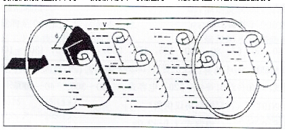 在蒸汽(qi)流體中(zhong)設置三(san)角柱型(xing)旋渦發(fa)生體,則(ze)從旋渦(wo)發生體(ti)⛱️兩側交(jiao)替地産(chan)生有規(gui)則的旋(xuan)渦,這種(zhong)旋渦稱(cheng)爲卡門(men)旋渦,如(ru)右圖所(suo)示,旋渦(wo)列在旋(xuan)渦發生(sheng)體下遊(you)非對稱(cheng)地排列(lie)。