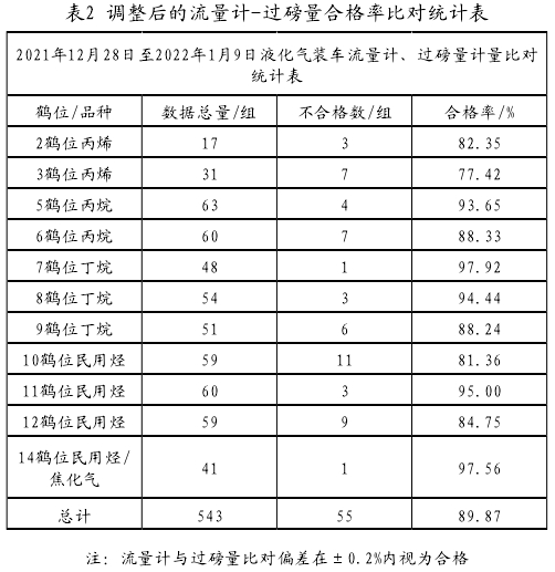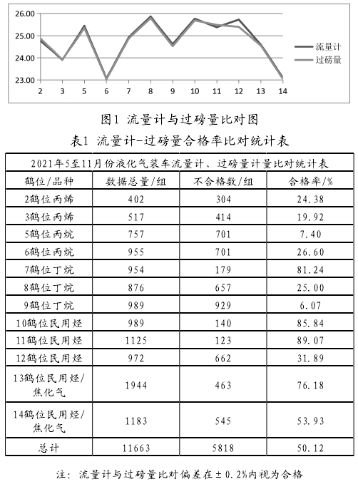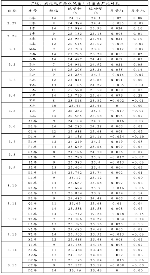 摘(zhai)要:煉油廠(chang)的液化石(shi)油氣主要(yao)組成部分(fen)爲丙烷、丙(bing)烯🌂、丁烷、延(yan)遲焦化液(ye)化石油氣(qi)等,由于其(qi)飽和蒸汽(qi)壓較高,容(rong)易導緻氣(qi)液兩相共(gong)存,因此,煉(lian)油廠的液(ye)化石油氣(qi)産♍品一直(zhi)是通過汽(qi)運過磅的(de)形式進行(hang)出廠計💘量(liang)。随着時代(dai)的發展,客(ke)戶對便捷(jie)、速度的要(yao)求,流量計(ji) 計量逐漸(jian)成爲迫切(qie)的需求。本(ben)文針對液(ye)化氣出廠(chang)💋從過磅計(ji)量到流量(liang)計計量的(de)轉變過程(cheng)中遇到的(de)問題進行(hang)⭐探索和分(fen)析,爲實際(ji)應用提供(gong)理論和技(ji)術方面的(de)指導。 前言(yan) 科氏質量(liang)流量計作(zuo)爲一種可(ke)以直接測(ce)量流體質(zhi)📧量流量📱的(de)精度高儀(yi)表,具有無(wu)可動部件(jian)和密封件(jian)、測量精度(du)受介質溫(wen)度、壓力及(ji)密度參數(shu)影響小的(de)特點平,同(tong)時由于流(liu)量💞檢測中(zhong)常用的流(liu)體物性參(can)數主要有(you)密度、粘度(du)、壓縮系數(shu)、比熱比和(he)氣體絕熱(re)指數,因此(ci)科氏質量(liang)流量計不(bu)僅應用💘于(yu)石油行業(ye),例如利用(yong)科氏質量(liang)流量計和(he)低含水分(fen)析儀計量(liang)外輸原油(you)的純油量(liang)中;在轉油(you)站使用質(zhi)量流量計(ji),用于各個(ge)計量站原(yuan)油的外輸(shu)計量和含(han)水分析。通(tong)過質量流(liu)量計對原(yuan)油的流量(liang)💃、密度進行(hang)測量,然後(hou)用密度法(fa)算出含水(shui)率,進而得(de)出純油量(liang)[3];同樣也廣(guang)泛應用于(yu)化工生産(chan)中,比如用(yong)于測量工(gong)藝管道中(zhong)流經的各(ge)種單獨介(jie)質的流體(ti)、各種漿液(ye)、非牛頓流(liu)🤞體、有足夠(gou)密度的中(zhong)高壓氣體(ti)、高🈲黏度👣流(liu)🈚體、含有微(wei)量氣體的(de)液體、懸浮(fu)液等,能夠(gou)充分滿足(zu)石油化工(gong)生産裝置(zhi)對質量流(liu)❌量的計量(liang)✌️要求。因此(ci)科氏質量(liang)流量計較(jiao)其他流量(liang)計具👌有明(ming)顯的優勢(shi),它不僅是(shi)提高産品(pin)質量的保(bao)障,而且是(shi)企業提高(gao)經🐕濟效益(yi)🚶的重要手(shou)段5I,逐步爲(wei)客戶所接(jie)受。但由❓于(yu)石油液化(hua)氣爲非均(jun)勻混合液(ye)體(例如含(han)水液化氣(qi)),易造成流(liu)量計測量(liang)管内部介(jie)質質量分(fen)布不均,造(zao)成測量誤(wu)差。因此,石(shi)油液化氣(qi)利用科氏(shi)質量流量(liang)計出廠一(yi)直是一個(ge)難點。 1.項目(mu)背景:過磅(pang)出廠與裝(zhuang)車流量計(ji)的數據比(bi)對 廠内液(ye)化氣出廠(chang)一直采用(yong)汽車衡出(chu)廠的計量(liang)方㊙️式㊙️。2025年11月(yue)27日至11月27日(ri),将流量計(ji)裝車數據(ju)與過磅量(liang)進行數據(ju)比對,部分(fen)比對結果(guo)如圖1。 在此(ci)期間共采(cai)集液化氣(qi)裝車台2~14鶴(he)位流量計(ji)一汽車🏒衡(heng)❄️計量比對(dui)數據11663組,結(jie)果發現其(qi)中不合格(ge)數據有5818組(zu),數據合格(ge)率爲50.12%,如表(biao)1所示。 從圖(tu)中的數據(ju)分析,流量(liang)計與過磅(pang)量的差距(ju)較大,流量(liang)計本身🐪的(de)計量還達(da)不到貿易(yi)交接的要(yao)求。經🈲過現(xian)🌏場勘查發(fa)現,科氏質(zhi)量流量計(ji)本身檢定(ding)完畢後,直(zhi)接回裝,并(bing)未按照現(xian)場的實際(ji)工況進行(hang)溫壓補償(chang),與此同時(shi),部分鶴位(wei)流量🚶♀️計的(de)安裝🚶♀️有應(ying)力的影響(xiang)。結合比🚶♀️對(dui)數據及現(xian)場分析,接(jie)下來對每(mei)個鶴位的(de)流量計進(jin)行了溫壓(ya)補償、消除(chu)應力,同時(shi)也對流量(liang)計部💃分參(can)數進行了(le)相應的調(diao)整。調整後(hou),流量計與(yu)過磅量的(de)部分比對(dui)數據,見圖(tu)(2)。 調整後,流(liu)量計與過(guo)磅量差量(liang)減小,再次(ci)收集流量(liang)計與過磅(pang)量的比對(dui)數據543組,其(qi)中不合格(ge)數據55組,數(shu)♌據合格率(lü)89.87%,相比👌調整(zheng)前數據合(he)格率提升(sheng)39.75%,如表2所示(shi)。 2.影響數據(ju)合格率的(de)因素 從上(shang)述兩次的(de)比對統計(ji)表可以看(kan)出,雖然合(he)格率有所(suo)提升,但還(hai)沒有達到(dao)使用流量(liang)計進行貿(mao)易交接的(de)條件。經過(guo)一個多月(yue)現場裝車(che)調研,發現(xian)影響數據(ju)比對的合(he)格率不僅(jin)與儀表安(an)裝應力、溫(wen)壓補償有(you)關,也受現(xian)場裝車操(cao)作、工藝操(cao)作、汽✂️車衡(heng)本身精度(du)等多方面(mian)影響。 (1)現場(chang)裝車操作(zuo)的影響 液(ye)化氣類産(chan)品裝車是(shi)一個典型(xing)的采用常(chang)壓開放式(shi)鶴位裝車(che),槽車開至(zhi)所分配的(de)鶴位,車輛(liang)停穩熄火(huo)後,由裝車(che)操作人員(yuan)将鶴管放(fang)置到槽車(che)底部,同時(shi)将防靜電(dian)接地夾夾(jia)在槽車上(shang)。完成🐆準備(bei)工作後,操(cao)作人員🔴在(zai)鶴位批控(kong)器上輸入(ru)裝車密👈.碼(ma),打開氣動(dong)二段式裝(zhuang)車球閥,開(kai)始裝車。開(kai)始時裝車(che)閥打開⭐一(yi)半開度,以(yi)低流速裝(zhuang)車,5s以後,裝(zhuang)車閥全部(bu)打💯開。然🐪後(hou)根據現場(chang)實際工況(kuang),随時調節(jie)流量,做好(hao)錯車準備(bei)。達到預裝(zhuang)量後,人工(gong)或者自動(dong)關閉批控(kong)器,完成裝(zhuang)車。從上🏃♀️述(shu)裝