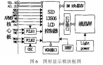 由于(yu)AT91RM9200處理(li)器未(wei)集成(cheng)圖形(xing)顯示(shi),核心(xin)闆上(shang)也未(wei)提供(gong),所以(yi),要實(shi)現🐉圖(tu)形顯(xian)示,必(bi)須構(gou)建圖(tu)形顯(xian)示模(mo)塊。電(dian)路采(cai)用LCD控(kong)制器(qi)SID13506顯示(shi)芯片(pian)[7]實現(xian)彩色(se)液晶(jing)點陣(zhen)顯示(shi)和VGA标(biao)準接(jie)口。系(xi)統框(kuang)圖如(ru)圖6所(suo)示。