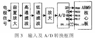 檢(jian)測輸(shu)入模(mo)塊包(bao)括差(cha)分測(ce)量放(fang)大器(qi)、低通(tong)和高(gao)通濾(lü)波器(qi)、增益(yi)放大(da)器以(yi)及A/D轉(zhuan)換電(dian)路,如(ru)圖3所(suo)示。圖(tu)3輸入(ru)及A/D轉(zhuan)換框(kuang)圖。