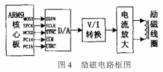 的勵(li)磁電(dian)路的(de)任務(wu)是向(xiang)勵磁(ci)線圈(quan)提供(gong)一穩(wen)定的(de)驅🈲動(dong)電⭐流(liu)‼️。電流(liu)波形(xing)爲方(fang)波、三(san)值方(fang)波和(he)梯形(xing)波[11]等(deng)㊙️形式(shi),波形(xing)‼️變化(hua)♍的目(mu)的是(shi)結合(he)信号(hao)處理(li)電路(lu),分析(xi)📧在不(bu)同勵(li)磁方(fang)🍉式下(xia)電🥰磁(ci)流量(liang)計的(de)精度(du)、零點(dian)穩定(ding)性和(he)抗能(neng)📞力等(deng)多項(xiang)🐪指标(biao)。該電(dian)路由(you)核心(xin)🤩闆的(de)SPI2口輸(shu)出數(shu)字量(liang),經過(guo)D/A轉換(huan)形成(cheng)模拟(ni)信号(hao),經V/I轉(zhuan)換激(ji)勵和(he)帶有(you)電流(liu)負反(fan)饋的(de)電流(liu)放大(da)器輸(shu)出,适(shi)合各(ge)種勵(li)磁波(bo)形的(de)變化(hua)。結構(gou)框圖(tu)如圖(tu)4。D/A轉換(huan)電路(lu)采用(yong)AD7243芯片(pian)[5],實現(xian)12位的(de)SPI同步(bu)串行(hang)輸入(ru),-5~+5V的雙(shuang)極性(xing)輸出(chu)。與ARM9核(he)心闆(pan)👉的SPI2口(kou)對接(jie),如圖(tu)4所示(shi)。