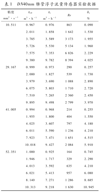 對(dui)量程(cheng)範圍(wei)1~10m³/h、精度(du)等級(ji)1.5級的(de)DN40mm浮子(zi)流量(liang)傳感(gan)器進(jin)行實(shi)驗研(yan)究。qxo是(shi)刻度(du)流量(liang),qvomax爲流(liu)量傳(chuan)感器(qi)量程(cheng)上限(xian),qv是❓實(shi)際流(liu)量🌈,δ1是(shi)滿度(du)誤差(cha),δ1=|(qy0-qy)1/qxomax100%,實驗(yan)數據(ju)見表(biao)1。