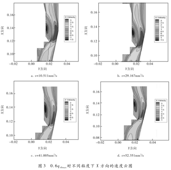 爲了(le)直觀(guan)地反(fan)映同(tong)一流(liu)量點(dian)不同(tong)粘度(du)下流(liu)量傳(chuan)感器(qi)中🥵速(su)度的(de)變化(hua),選取(qu)0.6qyDmax時不(bu)同粘(zhan)度.下(xia)X方向(xiang)速度(du)進行(hang)分析(xi),速度(du)雲圖(tu)如圖(tu)3所示(shi)。