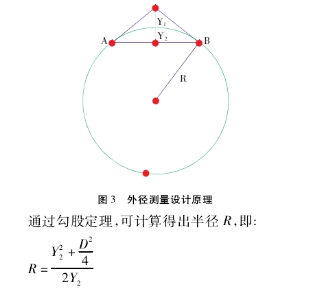 外(wai)徑測量設(she)計原理如(ru)圖3所示,圖(tu)中R爲目标(biao)測量對象(xiang),A、B兩點🍓爲設(she)備觸點,A和(he)B的主體支(zhi)架采用固(gu)定支架,其(qi)中AB之間的(de)距離爲固(gu)定⛱️值D,Y1爲伸(shen)縮量尺,Y2爲(wei)縮進距離(li)。