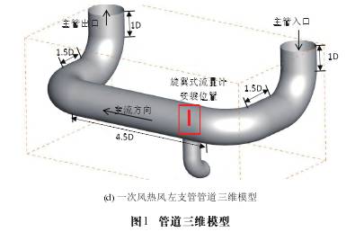 根據(ju)現場測(ce)量獲得(de)三号鍋(guo)爐一次(ci)風管道(dao)尺寸,确(que)定管道(dao)計算模(mo)型。見圖(tu)1(a)爲一次(ci)風總進(jin)風管道(dao),風機位(wei)于流量(liang)計安裝(zhuang)位置下(xia)層約6.7D處(chu),流體自(zi)下向上(shang)流動,管(guan)道上方(fang)彎頭距(ju)離⚽流量(liang)計安裝(zhuang)位置大(da)于6D,此處(chu)安裝直(zhi)管段長(zhang)度符合(he)插入式(shi)流量計(ji)的直管(guan)段要🙇♀️求(qiu),因此不(bu)必進行(hang)模拟分(fen)析。一次(ci)風總🌈進(jin)風管道(dao)後♈方進(jin)入空氣(qi)預🧑🏽🤝🧑🏻熱器(qi)加熱後(hou)分成左(zuo)右兩條(tiao)支管進(jin)🔱入左右(you)風室,由(you)于👉左右(you)支✉️管結(jie)構對稱(cheng),因此隻(zhi)取其中(zhong)一次風(feng)熱風左(zuo)支管進(jin)行建模(mo)研究。圖(tu)1(b)、(c)火力發(fa)電📐插入(ru)式流✊量(liang)計在熱(re)電🎯行業(ye)的應用(yong)爲所研(yan)究一次(ci)風熱風(feng)左支管(guan)出口垂(chui)直管道(dao)和一次(ci)風熱風(feng)左支管(guan)入口水(shui)平管道(dao)。根據三(san)号鍋爐(lu)一次風(feng)熱風左(zuo)支管管(guan)🔴道參數(shu)建立三(san)維模型(xing),見圖1(d),圖(tu)中标注(zhu)位置爲(wei)原旋翼(yi)式流量(liang)計安裝(zhuang)位置。