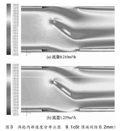 比較(jiao)圖3(a)和(he)圖3(b)、圖(tu)4(a)和圖(tu)4(b),可以(yi)看出(chu)當流(liu)體粘(zhan)度一(yi)定時(shi),流量(liang)越大(da),葉輪(lun)的尾(wei)部低(di)流速(su)區越(yue)小。當(dang)頂端(duan)間隙(xi)由0.2mm增(zeng)加:至(zhi)0.5mm時,對(dui)于相(xiang)♋同粘(zhan)度的(de)流體(ti)和相(xiang)同的(de)流量(liang)點,葉(ye)輪尾(wei)部低(di)流速(su)區🤞變(bian)小,表(biao)明葉(ye)輪旋(xuan)轉角(jiao)速度(du)增大(da),即儀(yi)表系(xi)數變(bian)大。但(dan)在小(xiao)流量(liang)點處(chu)♉,低流(liu)速區(qu)的相(xiang)對變(bian)化較(jiao)之于(yu)大流(liu)🈲量點(dian)處要(yao)大,即(ji)小流(liu)量點(dian)處葉(ye)輪轉(zhuan)速的(de)相對(dui)變化(hua)比大(da)流量(liang)點處(chu)要大(da)❓,則儀(yi)✂️表系(xi)數的(de)增加(jia)值相(xiang)對也(ye)大,故(gu)渦輪(lun)的線(xian)性度(du)誤差(cha)減小(xiao)。