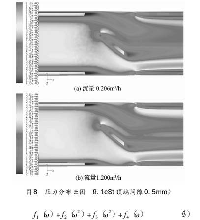 比(bi)較圖(tu)5(a)和圖(tu)5(b)、圖6中(zhong)的圖(tu)6(a)和圖(tu)6(b),可以(yi)看出(chu),對于(yu)相同(tong)粘度(du)的流(liu)體🛀,随(sui)着流(liu)量的(de)增大(da),高壓(ya)區的(de)面積(ji)變大(da),且向(xiang)葉片(pian)的✍️尾(wei)部和(he)頂端(duan)移動(dong),緻使(shi)葉片(pian)所受(shou)驅動(dong)力矩(ju)增加(jia)♉,葉輪(lun)旋轉(zhuan)角速(su)度增(zeng)大。對(dui)于相(xiang)同粘(zhan)度的(de)流體(ti)在相(xiang)同☀️的(de)流量(liang)點處(chu),頂端(duan)間隙(xi)由0.2mm增(zeng)大至(zhi)0.5mm時,比(bi)較圖(tu)5和圖(tu)6可以(yi)看出(chu),葉片(pian)表面(mian)的高(gao)壓區(qu)面積(ji)變大(da),且向(xiang)葉片(pian)的尾(wei)部和(he)頂端(duan)移動(dong),緻⭐使(shi)葉輪(lun)所受(shou)驅動(dong)力矩(ju)增加(jia),而由(you)圖7和(he)圖8可(ke)以看(kan)出葉(ye)片♍尾(wei)部的(de)低壓(ya)區💔面(mian)積變(bian)小,葉(ye)輪旋(xuan)轉的(de)阻力(li)減小(xiao),則旋(xuan)轉的(de)角速(su)度🍓增(zeng)大,即(ji)儀表(biao)系數(shu)增大(da)🧑🏽🤝🧑🏻。